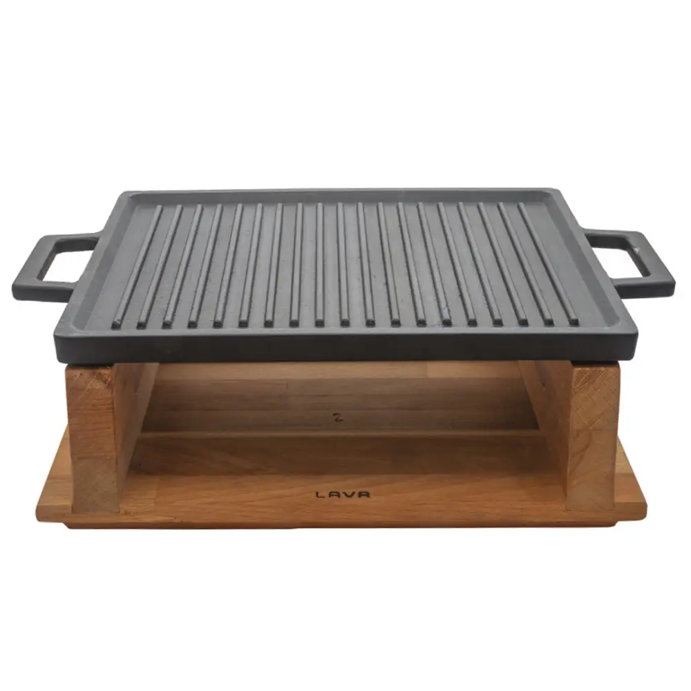 פלטה להגשה / שרות מיציקת ברזל דו-צדדית (גריל/חלק) ומעמד עץ
